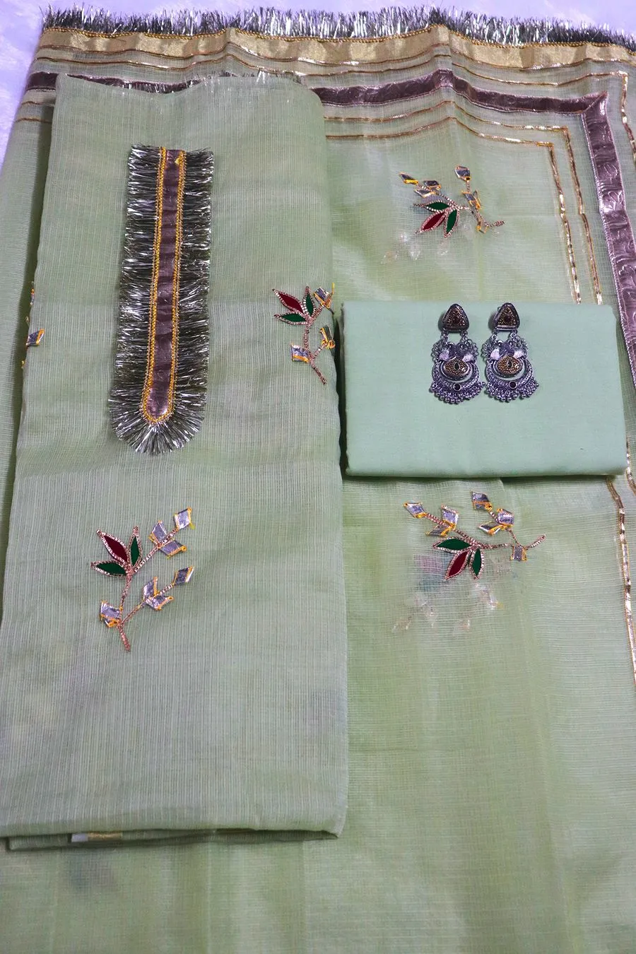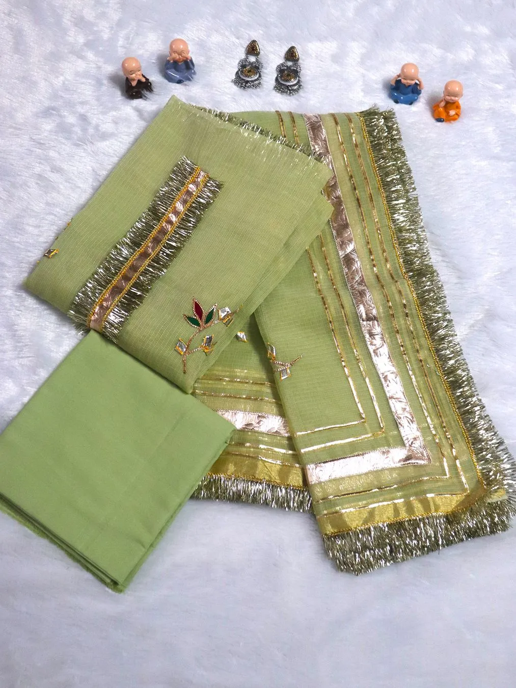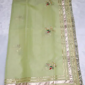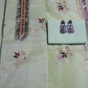 Dazzle in parties with our Partywear Green Kota Doria suit adorned with exquisite Golden Gota Patti handwork. Perfect for weddings, festive gatherings, receptions, and family functions, this outfit beautifully blends traditional craftsmanship with modern elegance.