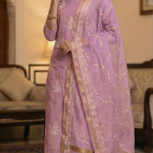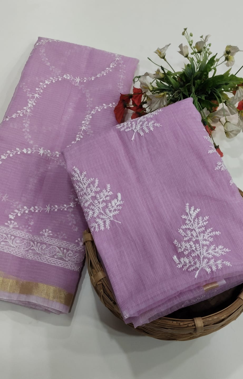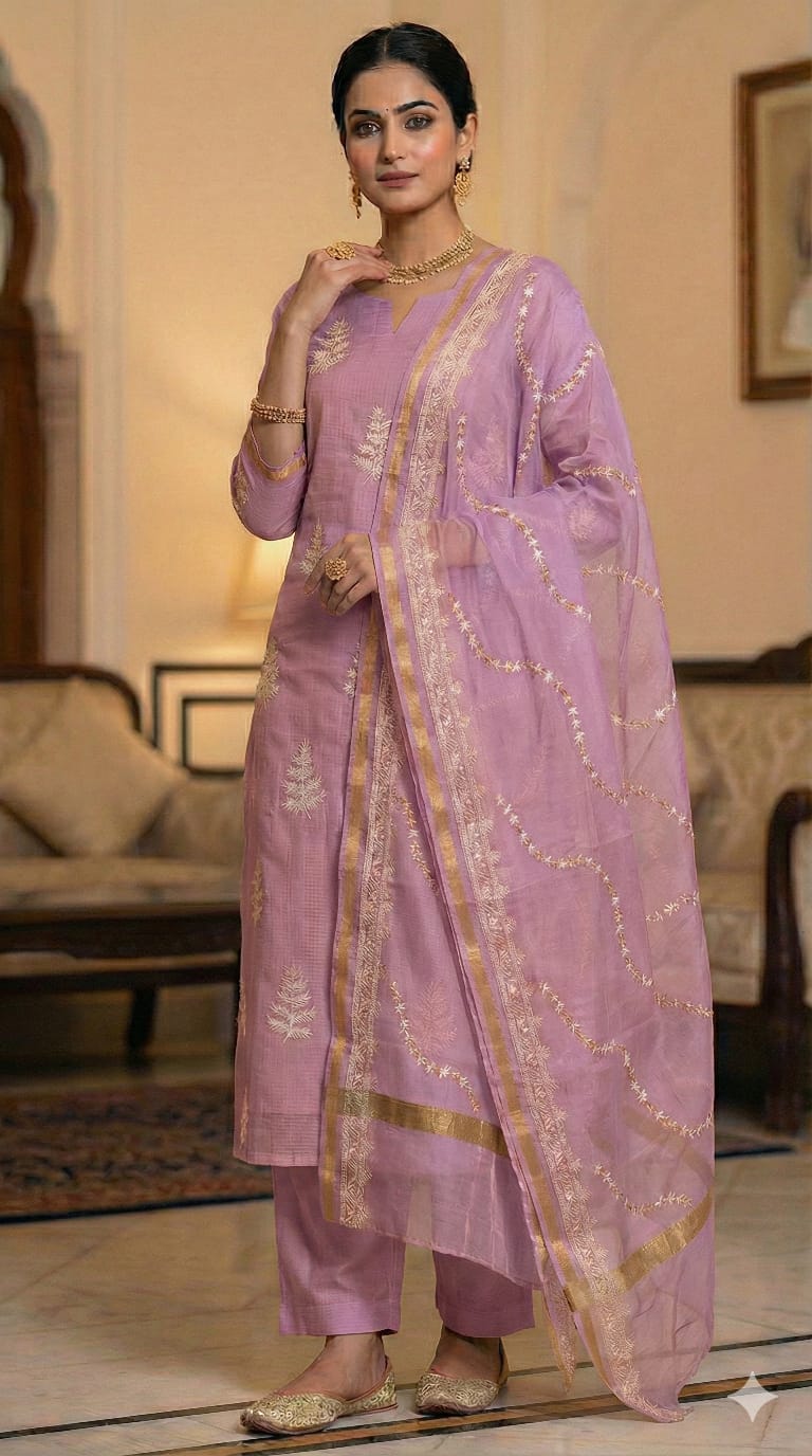 Dazzle in parties with our Partywear Lavender Kota Doria Suit Material adorned with exquisite white thread work. Perfect for weddings, festive gatherings, receptions, and family functions, this outfit beautifully blends traditional craftsmanship with modern elegance.