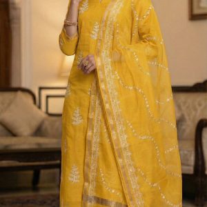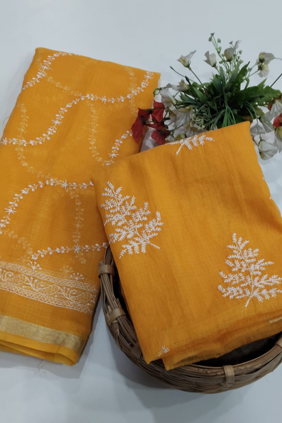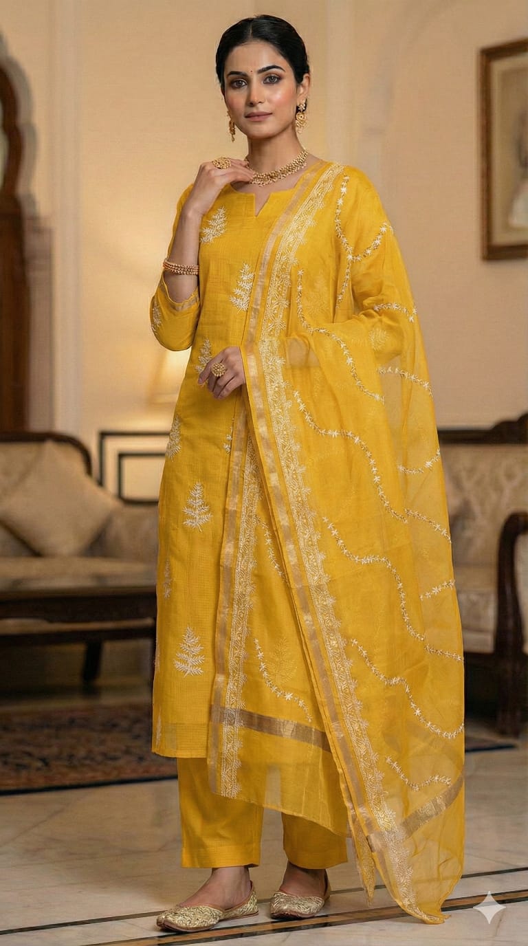 Dazzle in parties with our Partywear Yellow Kota Doria Suit Material adorned with exquisite White Thread Work. Perfect for weddings, festive gatherings, receptions, and family functions, this outfit beautifully blends traditional craftsmanship with modern elegance.