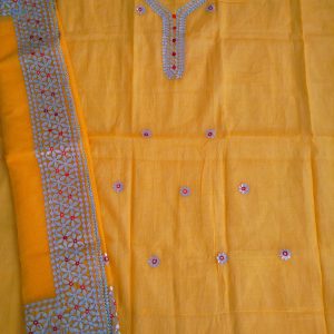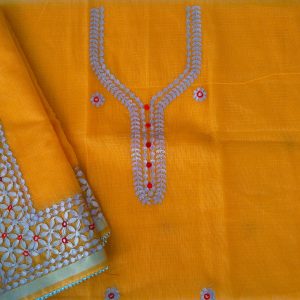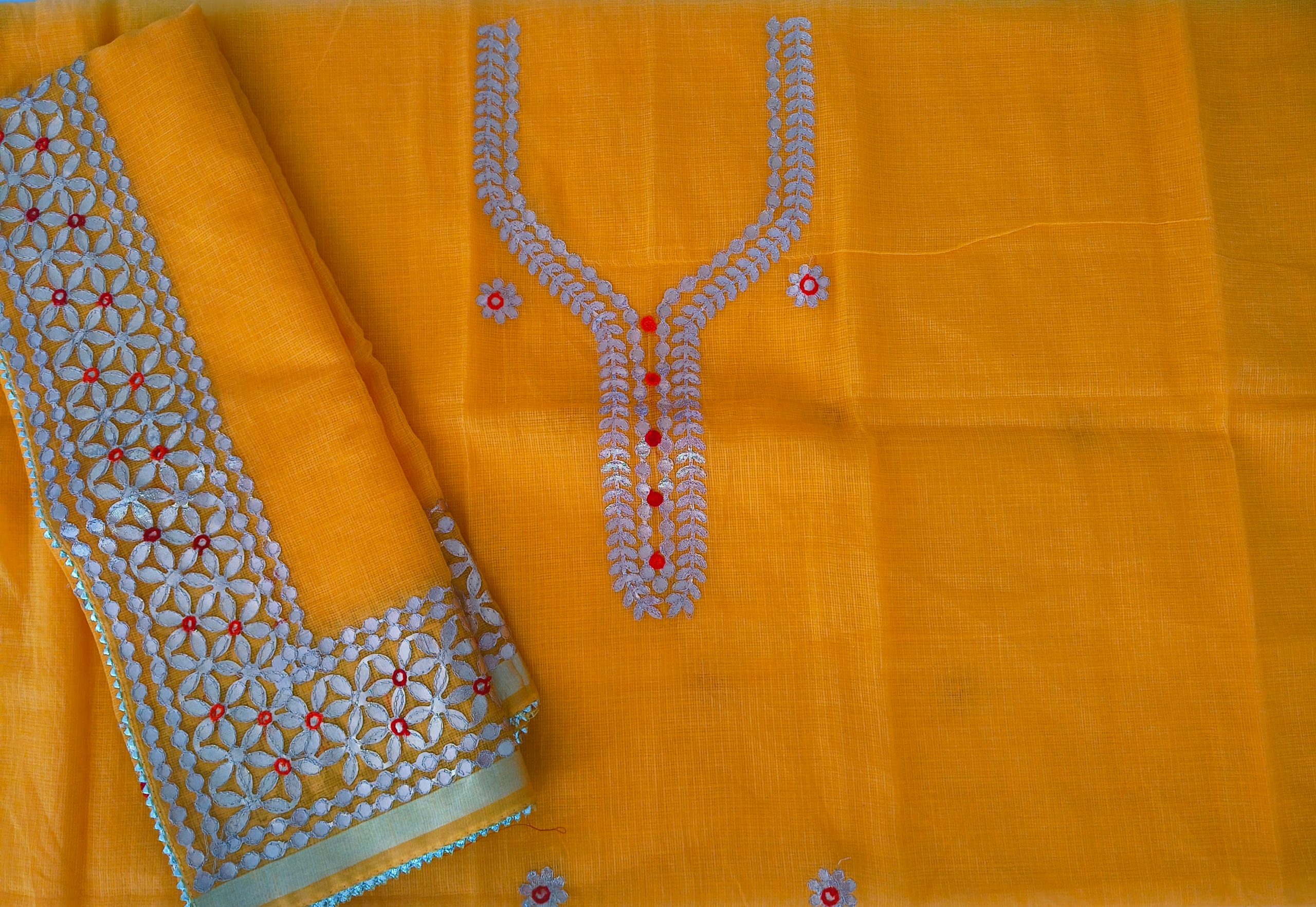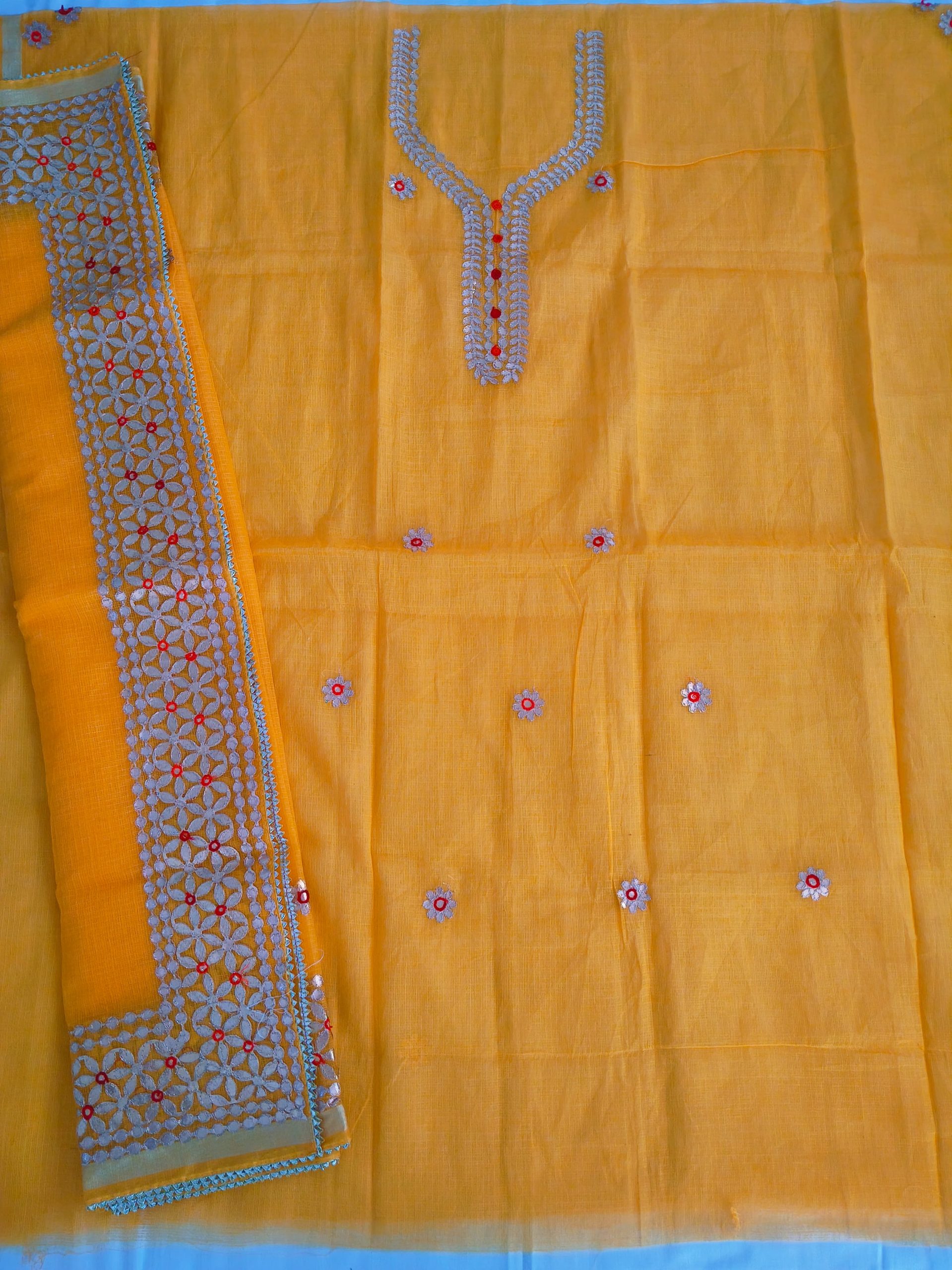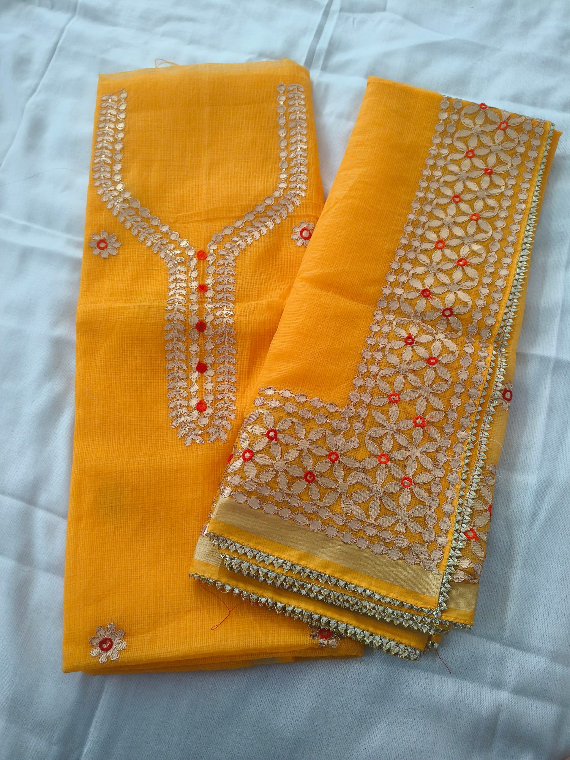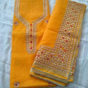 Dazzle in parties with our Partywear Yellow Kota Doria Suit Material adorned with exquisite Silver Gota handwork. Perfect for weddings, festive gatherings, receptions, and family functions, this outfit beautifully blends traditional craftsmanship with modern elegance.